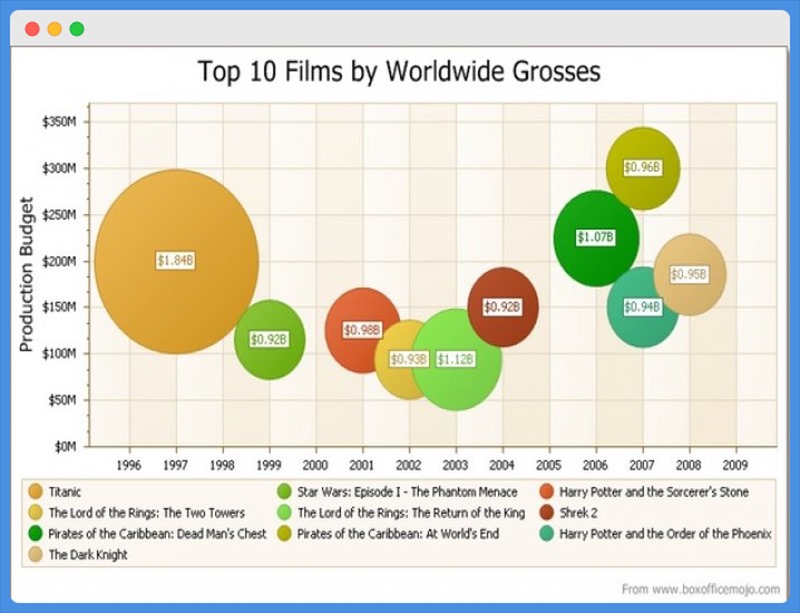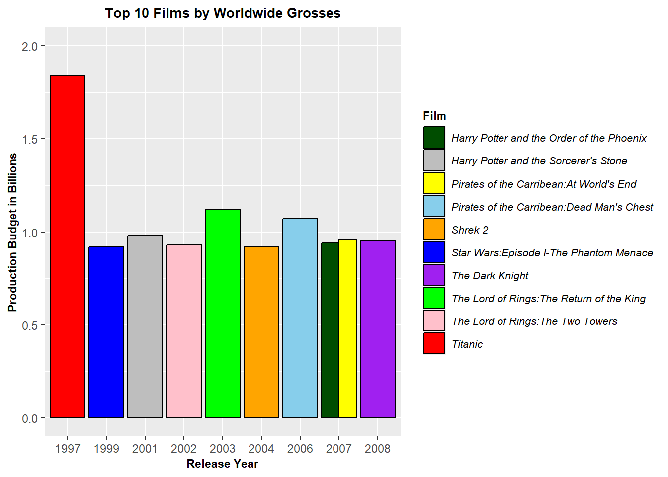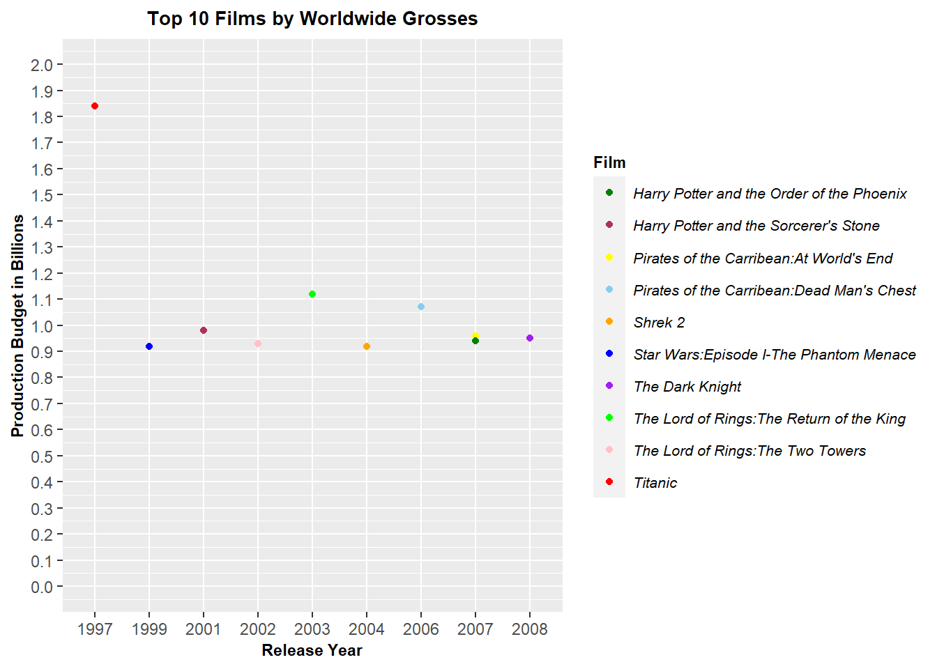 labs(x ="Release Year",y="Production Budget in Billions",title ="Top 10 Films by Worldwide Grosses")+