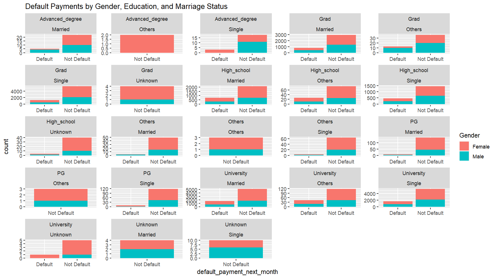 In conclusion, certain demographic groups indeed have a higher or lower likelihood of defaulting. Males in several panels, individuals with lower educational attainment, and singles are more prone to defaulting. Conversely, those with advanced degrees, particularly when married, show a lower likelihood of default. These insights are critical for credit risk management, allowing for tailored risk assessment strategies and targeted financial advice or product offerings to mitigate potential defaults.