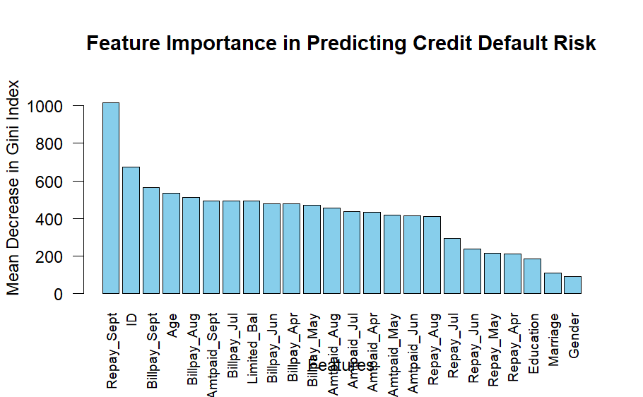 Variable Importance Measures: The importance function is applied to the trained Random Forest model (rf_model) to obtain variable importance measures. Variable importance provides insights into which predictor variables are most influential in predicting the target variable (credit default risk). The measure used here is the Mean Decrease in Gini Index. The obtained variable importance measures are sorted in descending order using the order function. Sorting helps in identifying the most important predictor variables at the top of the list.